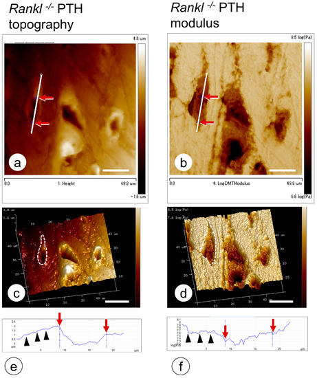 Nano-indentation by atomic force microscopy on bone matrix surrounding osteocytic lacunae. (a,c) Topography of osteocytic lacunae in the femoral cortical bone of the PTH-administered Rankl−/− mice. (b,d) Elastic modulus of the osteocytic lacunae in the femoral cortical bone of the PTH-administered Rankl−/− mice. Red arrows along the white lines in a and b are matched with the red arrows in the graphs (e,f). Note the slightly expanded diameters in the three-dimensional images of the elastic modulus (compare the dotted circles in (c,d)), and that the index of the elastic modulus is lower than the topography in the graph (black arrowheads). Bar, 20 mm.