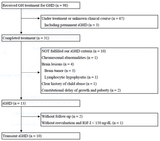 - Smyczyńska, J.; Stawerska, R.; Lewiński, A.; Hilczer, M. Incidence and predictors of persistent growth hormone deficiency (GHD) in patients with isolated, childhood-onset GHD. Endokrynol. Pol. 2014, 65, 334–341. [Google Scholar] [CrossRef]
