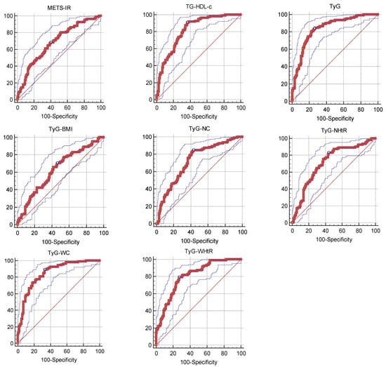The results of ROC and AUC analysis, the 95% confidence interval, optimal thresholds, corresponding sensitivity, corresponding specificity, and Youden’s index values for the whole study group by each IR index are presented in Table 3. The ROC of each IR index is shown in Figure 1. According to Table 3, all IR indexes acquired significant accuracy in diagnosing MetS in the studied population. These were >8.882048782 for TyG, >249.3913555 for TyG-BMI, >860.7463699 for TyG-WC, >5.365297405 for TyG-WHtR, >328.0513282 for TyG-NC, >1.9845651 for TyG-NHtR, >2.552631579 for TG-HDL-c, and >43.82124867 for METS-IR. The most significant AUC were for TyG-WC (0.849 (0.800–0.889)), TyG (0.837 (0.787–0.879)), and TG-HDL-c (0.817 (0.765–0.861)). The lowest AUC were for TyG-BMI (0.630 (0.569–0.688)), METS-IR (0.683 (0.623–0.738)), and TyG-NHtR (0.713 (0.654–0.766)). The most remarkable sensitivities were for TG-HDL-c (90.99%), TyG-WC (89.19%), and TyG-NC (84.68%), and the lowest were for METS-IR (68.47%), TyG-BMI (70.27%), and TyG-WHtR (79.28%). The greatest specificities were for TyG (73.89%), TyG-WHtR (72.61%), and TyG-WC (66.88%), and the lowest were for TyG-BMI (53.5%), TyG-NHtR (56.05%), and TyG-NC (56.69%).
