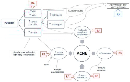 - Karadag, A.S.; Ertugrul, D.T.; Tutal, E.; Akin, K.O. Short-term isotretinoin treatment decreases insulin-like growth factor-1 and insulin-like growth factor binding protein-3 levels: Does isotretinoin affect growth hormone physiology? Br. J. Dermatol. 2010, 162, 798–802. [Google Scholar] [CrossRef]