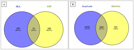 Venn diagram depicting the overlapping genes (A) of active compounds of sunflower seeds essential oil (SSEO) from two databases (Similarity Ensemble Approach and Swiss Target Prediction) and (B) associated with type-2 diabetes mellitus targets (from GeneCards and DisGeNet databases).
