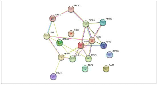 The 17 SSEO–T2D overlapping genes presented a network depicting 17 nodes (containing PPARD, FABP4, PTPRC, NODI, LPAR1, GPR35, PPARG, PPAR, TRPV1, CNR1, FFAR4, GSTK1, TOP1, RARB, FOLH1, GPR35, LPAR1, and CPT2) among the involved proteins and 24 edges connecting each respective nodes and achieved in a PPI construction network made from STRING and Cytoscape (Figure 3). The edges were taken as the number of degrees for each target, indicating targets with the highest number of degrees as the network’s best or leading target.