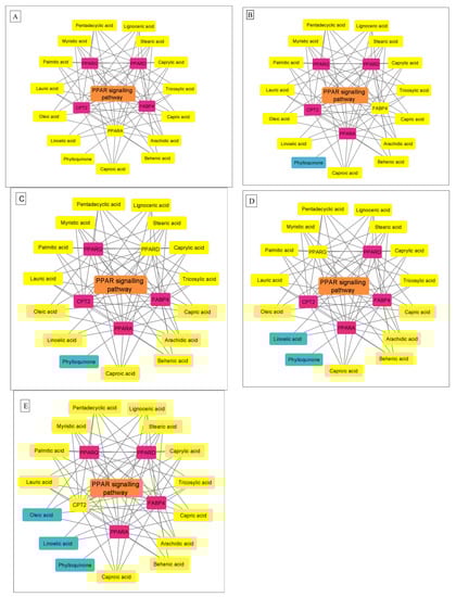 (A) PPARA gene (yellow node) interactions with 15 bioactive constituents of sunflower seeds essential oil (SSEO) against T2D; (B) FABP4 gene (yellow node) interaction with 14 SSEO compounds; (C) PPARD (yellow node) interaction with 14 compounds; (D) PPARG (yellow node) with 13 compounds and (E) CPT2 (yellow node) interactions with 12 compounds.
