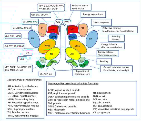 A schematic representation of the hypothalamic regions related to the neuropeptides that influence liver physiological functions, which are discussed in this review, is shown in Figure 1.