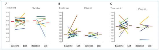 Figure Legend: Baseline and exit values for Vv(Col/int) (Panel (A)), Vv(Cell/int) (Panel (B)), and Vv(PTC/int) (Panel (C)) for each study participants randomized to Treatment or Placebo. Red bars indicate the average value for each group.