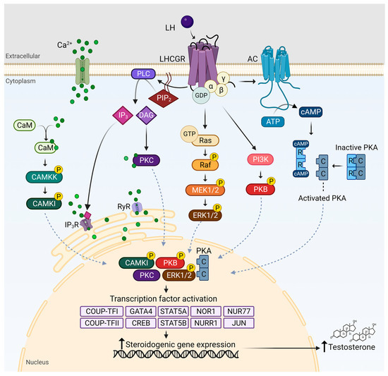 The binding of LH to LHCGR on the surface of Leydig cells activates multiple pathways, which trigger downstream signaling cascades via G-proteins (Figure 1). In the text that follows, we provide an overview of the primary pathways downstream of LH that promote Leydig cell steroidogenesis, which include PKA, CAMKI, ERK1/2, PKC and PKB/AKT.