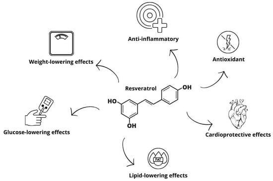 Resveratrol (3,5,4-trihydroxystilbene) is a phytoalexin that is considered a natural polyphenol with antioxidant and anti-inflammatory effects. This compound is found in different amounts in more than seventy plant species, as well as in beverages and foods—such as blackberries, peanuts, and grapes (and their derivatives, e.g., red wine) [10,11]. It is present in the isoforms cis and trans, with the latter being the most studied and filled with pharmacological properties [11], displaying several beneficial effects (Figure 1).