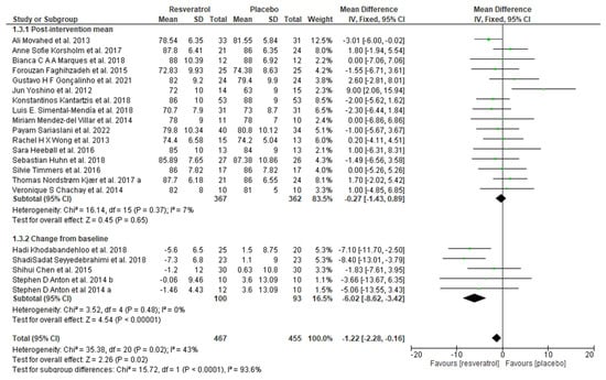 Forest plot depicting resveratrol versus placebo effects on glucose levels. Subgroup 1.4.1 summarizes the studies that provided post-intervention means [9,19,25,32,33,35,37,38,40,41,42,44,46,47,48,49,51,52,53,55,56,57,58,60,61,62]. Subgroup 1.4.2 summarizes the studies that provided a mean change from baseline [39,45,54,59].