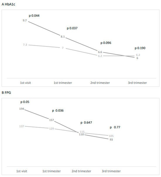 (A) HbA1c levels during pregnancy in patients with ODM (dark grey) and T2DM (light grey). (B) Fasting plasma glucose levels during pregnancy in patients with ODM (dark grey) and T2DM (light grey).