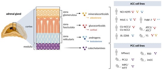 The adrenal gland is composed of the steroid hormone-secreting cortex and the catecholamine-secreting medulla (Figure 1). Adrenal-derived hormones are essential to regulate vital functions of the organism, including stress response, blood pressure and metabolism. Various benign and malignant tumors can originate from the adrenals, among them the highly malignant adrenocortical carcinoma (ACC) arising from the secretory cells of the adrenal cortex with an incidence rate of 0.5–2 cases per million and pheochromocytomas (PCCS) originating from the chromaffin cells of the adrenal medulla with an incidence rate of 0.8 cases per million yearly [].