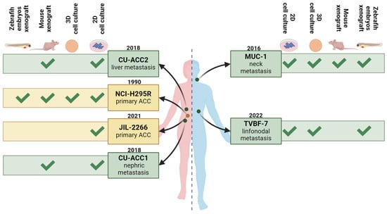 ACC is often diagnosed at advanced and metastatic stages. While surgical resection is the treatment of choice, the high number of recurrences and advanced staging often require systemic treatment strategies. Unfortunately, these remain inefficient in many cases, resulting in a 5-year survival rate of less than 44% []. For a long time, preclinical research was hampered due to the lack of appropriate in vitro models. However, currently, the field is rapidly progressing with six cell lines derived from human ACC which better reflect the complexities of this aggressive disease.