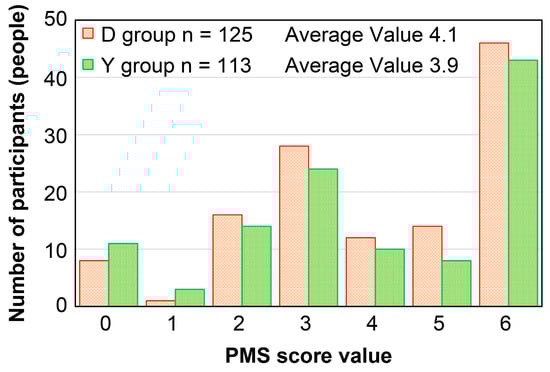 The numbers of participants for each PMS score in Groups D and Y before drug use is shown in Figure 1. The PMS scores of Groups D and Y before drug use were similar in terms of the number of participants, confirming that the PMS-like symptom status of participants before drug use was not significantly different between Groups D and Y. Scores of PMS-like symptoms in Groups D and Y were averaged and compared before, 3 months after, 3–6 months after, and 6 months after drug use. The average PMS scores of Groups D and Y at the abovementioned four stages are shown in Table 3.