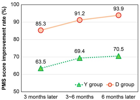 To assess the effect of improved PMS scores in Groups D and Y, the PMS scores for each group were calculated by subtracting the average scores at 3, 3–6, and 6 months after starting YZF and DNG treatment from the average score before drug administration. These scores were divided by the average score before drug administration and multiplied by 100 to obtain the PMS score improvement rate.