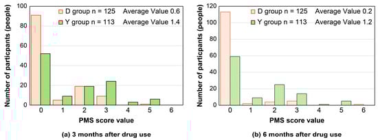 Figure 3 shows the number of participants with PMS scores (integer) in Groups D and Y. The proportion of participants with a score of 0 after 3 months of drug use was 72.8% and 46.0% in Groups D and Y, respectively. This number was significantly higher in Group D than in Group Y (p < 0.01), indicating early efficacy in Group D. Furthermore, the number of patients who continued to improve to a score of 0 for up to 6 months increased by only 7 in Group Y, while the number increased by 22 in Group D, indicating a 3.1-fold increase in the number of patients who became symptom-free (Table 4).