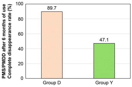 Furthermore, the complete disappearance rates of PMS-like symptoms were compared between the two groups. The complete disappearance rate was significantly higher in Group D than in Group Y (89.7% vs. 47.1%; p < 0.01) (Figure 4).