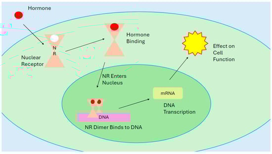 A diagram of a nuclear receptor. The hormone binds to the matching receptor inside the cell, forming a dimer complex. The dimer then binds to DNA and transcribes an mRNA sequence. The mRNA then leaves the nucleus and is converted to a protein, which affects the function of the cell.