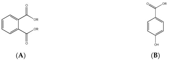 A phthalate is an ester of phthalic acid, with various varieties named after the carbon chain length attached to the base molecule (Figure 5A) [,,]. Several examples are dimethylphthalate (DMP), diethylphthalate (DEP), dibutylphthalate (DBP), and di-(2-ethylhexyl)phthalate (DEHP) []. Small-chain phthalates can be aerosolized; longer varieties will usually stay in solution []. They are used as fixatives and solvents in perfumes, and as components of the plastic bottles in which many types of personal care products are stored [,,,]. The phthalate molecules are not directly bound to the plastic polymers, allowing them to transfer to other liquids or solids that contact the plastic [,,]. Even if phthalates are not part of a particular product’s formula, they may still be found in products due to the phthalate dissolving into the product from the bottle itself [,,,]. Phthalates have been found to interfere with both thyroid and androgen receptors, along with being suspected of causing several types of cancer and birth defects [,,,,,,,,].