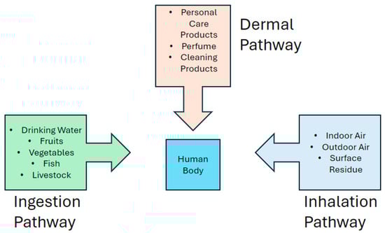 Bioaccumulation occurs when certain molecules cannot be removed easily from the body and slowly build up to a high concentration []. This is mainly caused by repeated exposure to chemicals from various sources (Figure 6) [,,,]. Hydrophobic molecules tend to bioaccumulate more easily by being absorbed into fat deposits inside organisms [,,]. The human body will attempt to metabolize and remove small amounts of EDCs, but when the number and amount of chemicals from external sources entering the body are too high, the body can no longer remove them effectively [,]. Bioaccumulation can easily lead to health concerns, as accumulating molecules can exceed recommended use levels in individuals exposed to multiple sources of the same molecule [,,]. Bioaccumulation also occurs in animals and plants in environments exposed to EDCs [,,,,].
