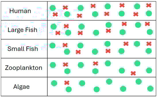 An example of biomagnification in an aquatic ecosystem. The green dots represent normal molecules present in the organism’s body, and the red symbols represent an EDC. As larger predators consume animals or plants lower on the food chain, they accumulate higher levels of EDCs from each level below.