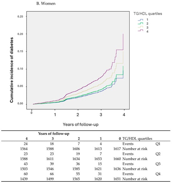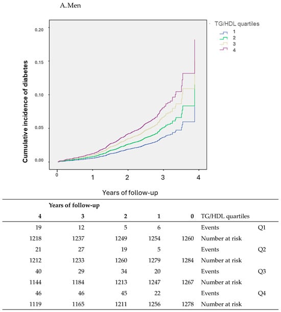 According to the Kaplan–Meier curve analysis, incidence rates of DM for the entire period of the four-year follow-up were higher in participants in the fourth quartile of TG/HDL for both men and women (Figure 2).