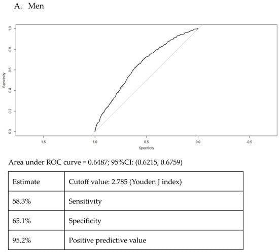According to Figure 3, the area under the curve was similar in women (0.66) and in men (0.64). The optimal TG/HDL cutoff was 1.72 for women and 2.78 for men.