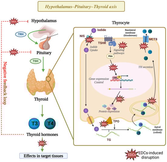 It is worth noting that thyroid function is finely regulated by the hypothalamic–pituitary–thyroid (HPT) axis. Parvicellular neurons of the hypothalamus secrete the thyrotropin-releasing hormone (TRH) in the median eminence region, which reaches the anterior pituitary through the hypophyseal portal system. In thyrotropes, the TRH binds to membrane receptors and stimulates the synthesis and secretion of the thyroid-stimulating hormone or thyrotropin (TSH). Once released into circulation, the TSH reaches the thyroid, where, by binding to its receptor, TSHR, it stimulates all steps involved in the synthesis and secretion of THs. THs, in turn, feedback to the system, inhibiting the synthesis and secretion of the TRH in the hypothalamus and the TSH in the pituitary, in a mechanism known as negative feedback [].