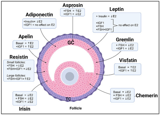 - Nikanfar, S.; Oghbaei, H.; Rastgar Rezaei, Y.; Zarezadeh, R.; Jafari-gharabaghlou, D.; Nejabati, H.R.; Bahrami, Z.; Bleisinger, N.; Samadi, N.; Fattahi, A.; et al. Role of Adipokines in the Ovarian Function: Oogenesis and Steroidogenesis. J. Steroid Biochem. Mol. Biol. 2021, 209, 105852. [Google Scholar] [CrossRef] [PubMed]