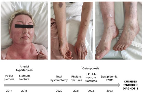 Upper panel: facial plethora of the patient, thin skin, easy bruising and leg edema. Lower panel: symptoms’ timeline.