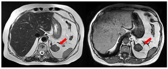 Abdominal MRI (T2–left and in/out of phase—right) depicting a 3.5 cm large left adrenal adenoma. Red arrows depict the left sided adrenal adenoma.