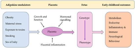 During pregnancy, the female body undergoes immense physiological challenges to nurture and support the developing fetus []. Fetal organ development during pregnancy is a highly regulated process, beginning with organogenesis in the first trimester, where key organ systems start to form. As the pregnancy progresses, these organs mature, with organogenesis in humans completed at the time of birth []. Thus, the in utero environment is critical for normal fetal growth and development. The ‘Developmental Origins of Health and Disease (DOHaD)’ hypothesis postulates that exposure to an adverse in utero environment during critical periods of development and growth can significantly impact an individual’s growth, and thus their short- and long-term health []. Central to this concept is the idea of developmental programming, where the developing fetus undergoes physiological and structural adaptations in response to the condition within the uterine environment []. In uncomplicated pregnancies, adaptation ensures the optimal survival of the fetus in the given intrauterine environment and later after birth. However, in adverse intrauterine environments, the consequent adaptations may be unsuitable for the environment after birth, potentially predisposing the individual to health challenges when such conditions do not persist []. Environmental impacts on fetal development can be mediated by the placenta, which forms an interface between maternal and fetal systems. Environmental perturbations, such as maternal nutrition, stress, and toxin exposure, can impact placental function, altering growth and thus impacting the programming of fetal organ development [] (Figure 1). Adipokines, which are cytokines primarily excreted by adipose tissue, play a number of tant roles during pregnancy. Adipokine concentrations can be modulated by environmental, physiological, or pathological changes, which impact placental function, subsequently affecting fetal growth and development. These interactions may increase the infant’s vulnerability to a range of disorders that may emerge later in life.