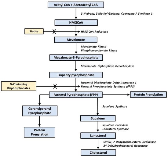 Cholesterol biosynthetic pathway with points of enzyme inhibition for statins and nitrogen-containing bisphosphonates. Steps in the pathway are noted in blue while enzymes are noted in black print for each step in the pathway. Arrows point from statins and N-containing bisphosphonates to the specific enzymes each inhibits.