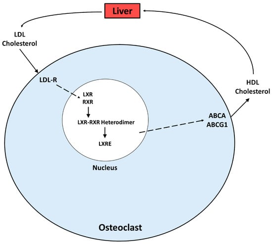 Liver X receptors (LXRs) and Retinoid X receptors (RXRs) are nuclear receptors that among other functions, are cholesterol-sensing receptors, though they also integrate metabolic and inflammatory signaling as discussed by Zelcer and Tontonoz []. LXR α plays a role in osteoclast function in cortical bone and LXR β does so in trabecular bone []. The knock-out of LXRα in female mice resulted in increased cortical bone mass in the presence of an increased number of endosteal osteoclasts, indicating that these osteoclasts were non-functional, as evidenced by reduced serum concentrations of tartrate-resistant acid phosphatase (TRAPC) and the C-telopeptide of type I collagen (CTX) []. Genes that are agonists of LXRα inhibit RANK ligand-induced gene c-FOS and nuclear factor of activated T cells, cytoplasmic 1 (NFAT-c1) expression, resulting in osteoclast apoptosis []. LXRs form heterodimers with RXRs to bind to the LXR response element (LXRE) on target genes []. These heterodimers stimulate the ABCA and ABCG1 membrane transporters in the osteoclast [] to assist in the efflux of cholesterol from the cell via HDL. Thus, the pathway of cholesterol efflux from the osteoclast is what ultimately contributes to the apoptosis of this cell type and the consequent reduction in bone resorption. This process is illustrated in Figure 2. The LXR-RXR heterodimer also appears to have pleiotropic functions as loss of RXRα and RXRβ in hematopoietic cells is associated with functionally deficient osteoclasts in a manner similar to what was reported by Joseph et al. [] with the knock-out of LXRα []. In addition, the combined knock-out of RXRα and RXRβ in mice resulted in protection from ovariectomy-induced bone loss []. These apparently discrepant actions may depend on the different interactions of LXRs and RXRs with other intracellular factors.