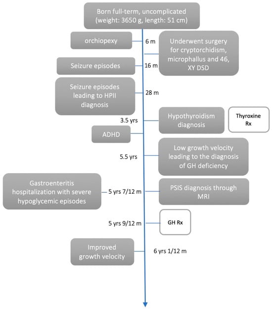 In both types of hyperprolinemia, proline concentrations are markedly elevated, 3–5 times higher in HPI and 10–15 times higher in HPII []. HPI is biochemically diagnosed through elevated plasma proline without urinary P5C excretion, while the latter in the urine indicates HPII []. Enzyme activity assessments and genetic analyses are viable diagnostic approaches []. Until now, the co-occurrence of hyperprolinemia, reduced growth rate, and hypoglycemia have not been documented. Herein, we present the case of a patient with pre-existing HPII, diagnosed with Pituitary Stalk Interruption Syndrome (PSIS), using the CAse REports (CARE) guidelines [].