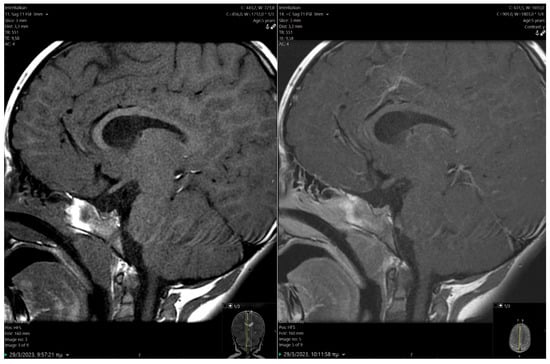 PSIS consists of an orphan syndrome involving the congenital abnormality of the pituitary gland, with three main characteristics: (i) the hypoplastic or inexistent anterior pituitary gland, (ii) absent or thin infundibulum, and (iii) ectopic posterior pituitary location. PSIS is presented during the first decade of life []. Several studies have attempted to explain the mechanisms that induce the triad of anomalies in PSIS. Two primary hypotheses posited for these abnormalities involve traumatic birth injuries (breech delivery, cesarean section, perinatal hypoxemia) and disturbances in the embryonic development of the hypothalamic–pituitary axis [,,], none of which was applicable in the present case. Identifying familial instances of PSIS and the co-occurrence of central nervous system (CNS) malformations suggest a potential genetic origin, prompting molecular studies aimed at identifying responsible gene mutations [,,]. However, the family history was unremarkable. Midline CNS malformations infrequently associated with PSIS involve optic nerve hypoplasia, absent septum pellucidum, and Chiari malformation [,,,]. Additional anomalies include micropenis and cryptorchidism [], the latter being surgically corrected in our case.