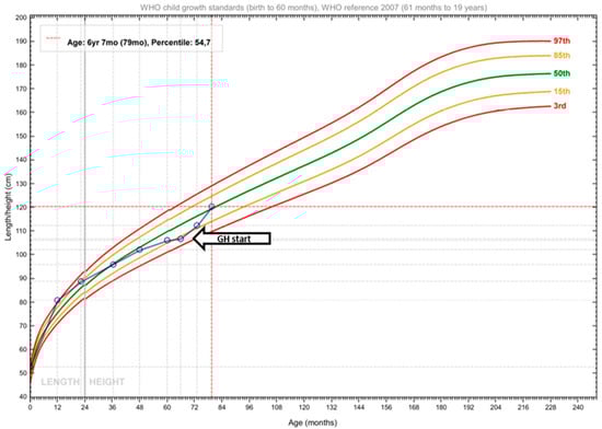Regular communication with the family was maintained to address other potential hypoglycemic episodes or any adverse effects associated with rhGH administration. Both the patient and his parents were extremely satisfied with the therapy, as the child showed no adverse events and did not suffer any further hypoglycemic or seizure episodes. The boy’s height before treatment was 106.8 cm [height-for-age z-score (HAz) −1.28 at 5 6/12 years of age], and his annual growth rate was 3.3 cm. During the scheduled follow-up to evaluate growth at 7 months (4 months post-rhGH treatment initiation), his growth velocity increased remarkably, resulting in a gain of 5.5 cm and a height of 112.3 cm (HAz −0.85). Almost 10 months after rhGH therapy, the child’s height was 120.3 cm (HAz 0.14) (Figure 3), with an annual growth rate of 5.5 cm. In addition, a positive developmental and behavioral change was observed within the first few months of GH replacement. Plasma proline concentration, at that time, was 2729 μmol/L (reference range: 40–332 μmol/L), whereas urine proline concentration was 1085 μmol/L (reference range: 0–9 μmol/L).