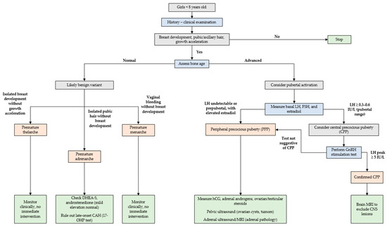- Bercaw-Pratt, J. Peripheral Precocious Puberty. In Female Puberty; Dietrich, J.E., Ed.; Springer: New York, NY, USA, 2014; pp. 79–88. ISBN 978-1-4939-0911-7. [Google Scholar]
