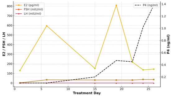 Hormone trends during ovarian stimulation in the 4th cycle. Serum estradiol (E2), follicle-stimulating hormone (FSH), luteinizing hormone (LH), and progesterone (P4) levels were measured throughout the treatment cycle. E2, FSH, and LH values are plotted on the left Y-axis, while P4 values are plotted on the right Y-axis. Despite the development of multiple follicles, serum E2 levels remained low, whereas P4 levels gradually increased during the luteal phase without ovulation.