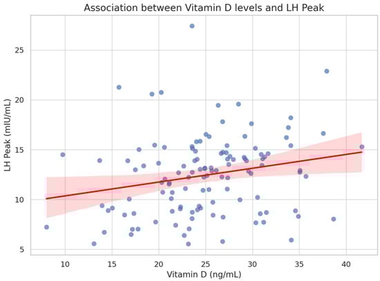 The analysis revealed that vitamin D was an independent predictor of LH peak (β = 0.125, p = 0.036). None of the other variables showed significant associations. More information is reported in Table 3 and Figure 1.
