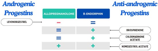 Main alterations in allopregnanolone and β-endorphin plasma levels induced by androgenic and anti-androgenic progestins commonly used in hormonal contraception.