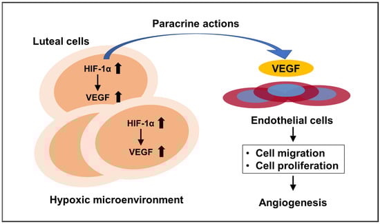 Angiogenesis in the ovarian corpus luteum. Angiogenesis is necessary for the growth of the corpus luteum. Hypoxia is the primary factor involved in up-regulation of pro-angiogenic protein expression. In the hypoxic microenvironment, HIF-1α mediates VEGF in the luteal cells throughout the corpus luteum formation. The VEGF produced by the luteal cells then acts on the endothelial cells through the paracrine action that induces cell migration and proliferation, leading to angiogenesis.