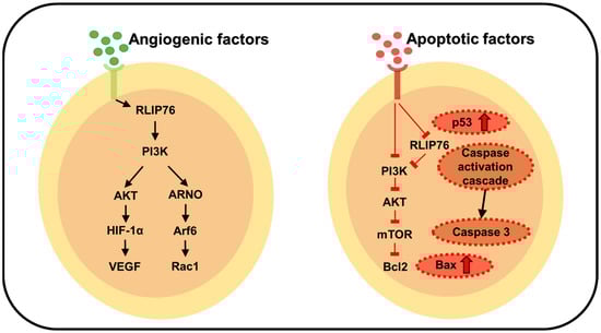 In the regulation of pro-angiogenic proteins, the hypoxia-induced mechanism is considered the primary element. Hypoxia significantly induces the up-regulation of factors with VEGF expression []. As shown in Figure 1, HIF-1α mediates VEGF expression in the ovarian cells. HIF-1α and VEGF are factors for corpus luteum formation via a hypoxia microenvironment []. Berisha et al. reported that HIF-1 mRNA is up-regulated in the early luteal stage during ovarian angiogenesis []. We also reported that RLIP76 is necessary for HIF-1α activation in melanoma and carcinoma cells. It resulted in a significant blockade of HIF-1α transcriptional activity []. The activation of HIF-1α transcription regulates stabilization, transactivation, and phosphorylation of HIF-1α []. In the HIF-1α pathway, PI3K/Akt signaling transduction mainly contributes to the HIF-1α activation via PI3-kinase activity []. Also, Zhang et al. reported that the signaling pathway of PI3K/Akt significantly participates in the induction of VEGF and HIF-1 expression in the ovarian luteal cells under hypoxia conditions []. In humans, RLIP76 regulates the up-stream signaling pathway in PI3K phosphorylation with the membrane receptors of growth factors and integrins. Those growth factors and integrins are important in the angiogenesis signaling pathway [,]. Moreover, the intercellular signaling of tumor cells and their surrounding environment in the local microenvironment is a key component in modulating the angiogenic signaling pathway that plays an important role in tumor growth [].