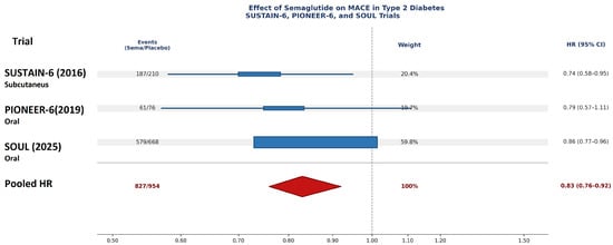 This systematic review and meta-analysis demonstrate that semaglutide significantly reduces major adverse cardiovascular events in patients with T2D at high cardiovascular risk. The pooled hazard ratio of 0.83 (95% CI: 0.76–0.92) represents a 17% relative risk reduction in MACE, with low heterogeneity (I2 = 25%) supporting consistency across trials and formulations.