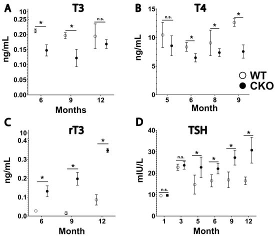 Plasma thyroid hormones and thyroid-stimulating hormone levels of CKO and W.T. male mice at different ages. (A) Significant changes in CKO T3 levels compared to W.T. at 6 months old [t (5) = 3.61, p = 0.015] and 9 months old [t (6) = 3.04, p = 0.023]. (B) Significant changes in CKO T4 levels at 6 months old [t (4) = 3.07, p = 0.037], 8 months old [t (4) = 4.54, p = 0.010], and 9 months old [t (4) = 6.56, p = 0.003]. (C) Significant changes in CKO rT3 levels compared to W.T. at 6 months old [t (6) = 6.54, p = 0.014], 9 months old [t (6) = 2.69, p = 0.036], and 12 months old [t (6) = 5.74, p < 0.005. (D) Significant changes in CKO TSH levels compared to W.T. at 5 months old [t (3) = 2.9, p <0.005], 6 months old [t (11) = 3.45, p = 0.005], 9 months old [t (5) = 3.95, p =0.011], and 12 months old [t (10) = 2.12, p < 0.005]. * p < 0.05 considered significant, CKO vs. W.T. male mice. n.s. (nonsignificant). Values are means ± S.E.; n = 3–5 mice/group. t-test was performed to compare CKO vs. W.T. male mice at 5, 6, 9, and 12 months. Repeated measures ANOVA was performed to monitor changes in TSH, T4, T3, and rT3 levels for each group.
