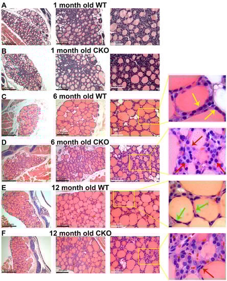 Hematoxylin and eosin (H&E) -stained thyroid gland sections from CKO and W.T. male mice. (A,B) 1-month-old W.T. and CKO mice showed no difference in the histology of the thyroid gland. (C) At 6 months old, W.T. mice had small follicles in the central zone and intermediate-to-large-sized follicles in the peripheral zone. Furthermore, the thyrocytes exhibited a columnar-to-cuboidal shape as pointed out by the yellow arrows in the enlarged image on the right, indicating that thyrocytes were active. (D) At 6 months old, CKO thyroid gland had smaller follicles which were irregularly distributed; furthermore, their thyrocytes appeared to be larger than W.T. thyrocytes (pointed out by red arrows in the enlarged image on the right). (E) In the 12-month-old W.T. thyroid gland, follicular size was larger than that of 6-month-old, and thyrocytes were flattened (pointed out by green arrows in the enlarged image on the right), indicating inactive thyrocytes. (F) The 12-month-old CKO thyroid gland had a similar feature as the 6-month-old CKO thyroid gland. Red arrow points to thyrocytes that are nonforming follicles in the enlarged image on the right.