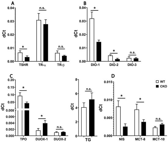 qPCR comparing the expression of specific genes in the thyroid gland between W.T. and CKO mice (8 months old). (A) The expression of various receptors. TSH-R showed significant reduction in CKO. [t (11) = 2.36, p = 0.035]. (B) The expression of DIO enzymes. DIO-1 showed significant reduction in CKO. [t (7) = 3.17, p = 0.016]. DIO-2 showed significant reduction in CKO. [t (8) = 2.95, p = 0.018]. (C) The expression of genes coding for enzymes involved in thyroid hormone synthesis. The expression of TPO was significantly reduced in CKO. [t (13) = 2.40, p = 0.032]. The expression of DUOX-1 was significantly reduced in CKO. [t (12) = 2.61, p = 0.023]. (D) The expression of iodide and thyroid hormone transporters. The expression of NIS was significantly reduced in CKO. [t (13) = 4.09, p < 0.005]. The expression of MCT-8 was significantly reduced in CKO. [t (6) = 3.03, p = 0.023, * p < 0.05 vs. W.T. male mice]. n.s.: nonsignificant. Values are means ± S.E.; n = 4–6 mice/group. t-test was performed to compare CKO and W.T. male mice.