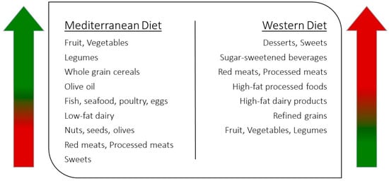Cutillas-Tolín and col. (2015) [18] analyzed the relationship between the MedDiet and the Western diet with semen quality parameters in 209 young and healthy men (aged 18–23 years). The researchers found that men who adhered more closely to the MedDiet had normal total sperm count and were more likely to have normal body mass index values, be non-smokers, and have a more active lifestyle [18]. In contrast, among those who preferred a daily Western dietary pattern, low sperm concentration was observed, particularly in overweight and obese men [18]. Indeed, foods included in the Western-style diet (Figure 1), such as high-fat dairy, red meats, and processed meat products (sources of saturated fat and trans fatty acids, respectively), have been inversely related to overall sperm parameters and total sperm count [22,23].