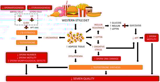Over the last several decades, the Western diet has been the culprit for the growing rate of obesity, which has had a significant negative effect on fertility due to its impact on hormonal levels, sperm function, and gamete molecular composition (Figure 2) [1,11,16,29]. Despite the fact that a higher body mass index has been associated with compromised sperm production and quality [6,30], the molecular mechanisms underlying obesity and male infertility are still not totally understood [31]. Increased body fat mass has been related to impaired reproductive potential due to its effect on the molecular and physical structure of sperm [6,32,33]. Obese men are more likely to be infertile due to the larger proportion of DNA fragmentation, abnormal morphology, and low mitochondrial membrane potential, which have been linked to high levels of ROS [32,33]. Regular consumption of a Western diet is directly associated with the high prevalence of obesity and its comorbidities (such as insulin resistance and diabetes) and has also been related to low sperm quality or function [34,35]. For instance, high-energy and high-fat diets (particularly those higher in animal fat and processed foods) have been associated with testicular disruption and, thus, impairments in spermatogenesis [11].