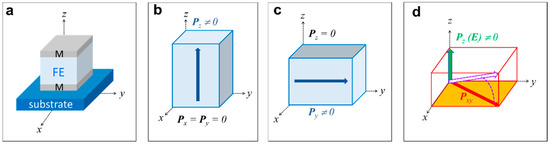 Schematics of (a) thin-film ferroelectric metal-ferroelectric-metal stack, (b) c-domain with out-of-plane polarization, (c) a-domain with in-plane polarization, (d) exaggerated r-type domain with spontaneous in-plane polarization and electric-field induced out-of-plane polarization.