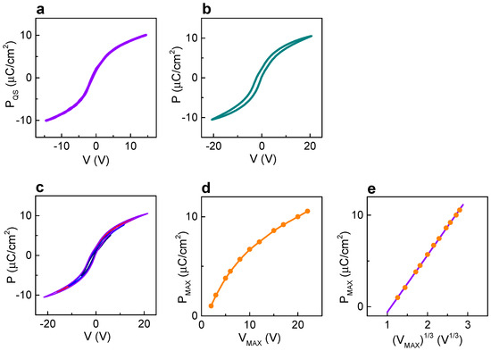 Consistent with this behavior, also the dynamic polarization—voltage (P–V) loop is very slim and practically hysteresis-free (Figure 2b). We note that slim P–V loops are measured at all magnitudes of maximum applied voltage VMAX (Figure 2c and Supplementary Figures S2 and S3), that is in striking contrast to regular ferroelectric loops with the Rayleigh-type shape at small sub-switching voltages. The maximum polarization PMAX increases with increasing maximum voltage VMAX (Figure 2c,d). The scaling behavior (PMAX ∞ (VMAX)1/3) is evidenced by a good linear fit in Figure 2e. This polarization-voltage scaling also agrees with our previous observations of polarization rotation [13].