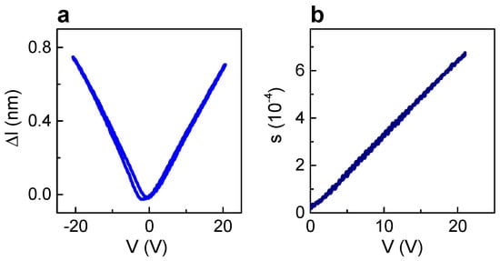 From the hysteresis-free polarization behavior (Figure 2), it is easy to understand the lack of hysteresis in the voltage dependence of the out-of-plane elongation ∆l (Figure 3a). Remarkably, the strain-voltage characteristic is perfectly linear (Figure 3b), which is often desirable but seldom achievable.